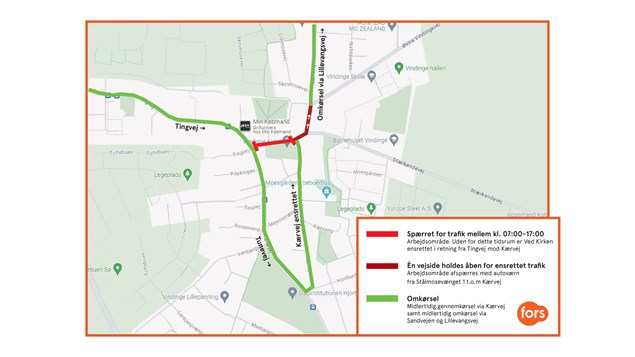 Under arbejdsperioden vil vejen Ved Kirken være spærret for kørsel på strækningen fra Tingvej til lige før Kærvej fra mandag til torsdag kl. 7-17. Uden for disse timer vil vejen være ensrettet fra Tingvej mod Kærvej. Trafikanter anbefales at benytte omkørselsruten via Lillevangsvej.
